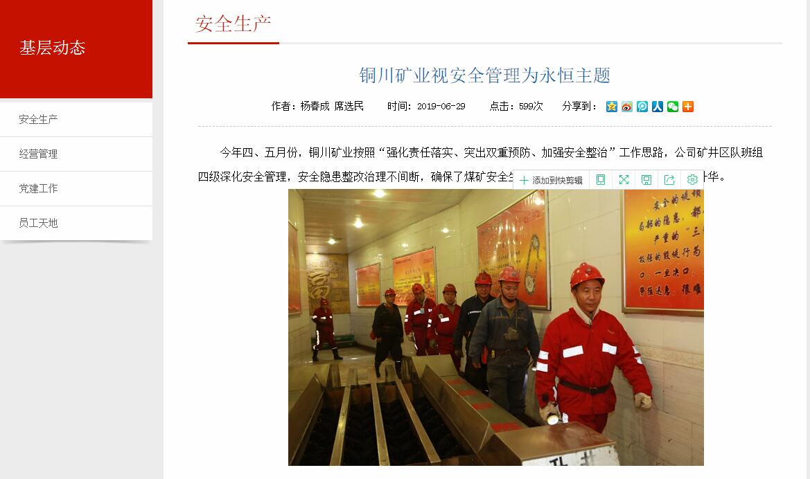今年四、五月份,銅川礦業(yè)按照“強(qiáng)化責(zé)任落實(shí)、突出雙重預(yù)防、加強(qiáng)安全整治”工作思路,公司礦井區(qū)隊(duì)班組四級(jí)深化安全管理,安全隱患整改治理不間斷,確保了煤礦安全生產(chǎn),使安全管理為永恒主題思想得到升華。