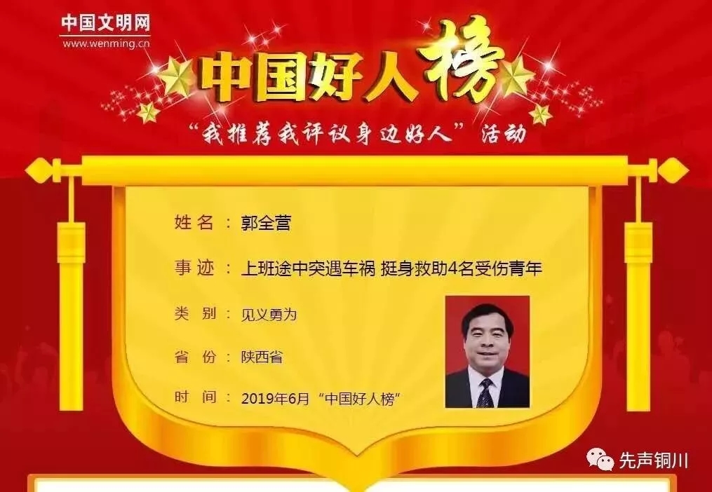 人活一世,能得“好人”二字評價不容易,能得“大好人”評價更是鳳毛麟角。陜煤集團銅川礦業(yè)原東坡煤礦礦長,現(xiàn)任銅川礦業(yè)公司副總工程師、棚改辦公室主任的郭全營,6月28日榮登“中國好人榜”,這是郭全營在今年4月26日榮登3—4月《陜西好人榜》之后,銅川礦業(yè)64年歷史上首位榮登“中國好人榜”見義勇為好人的職工。