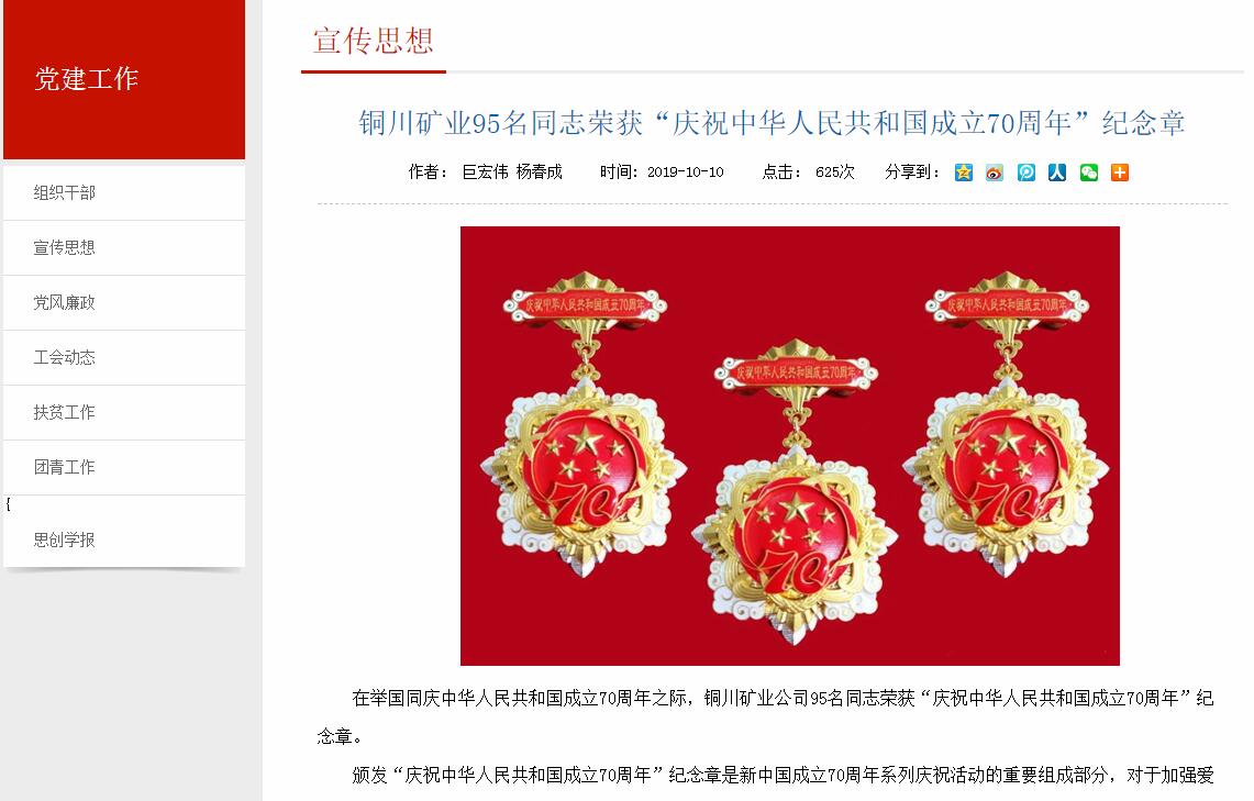 銅川礦業(yè)95名同志榮獲“慶祝中華人民共和國成立70周年”紀(jì)念章