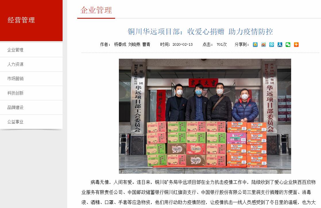 病毒無情,人間有愛。連日來,銅川礦務局華遠項目部在全力抗擊疫情工作中,陸續(xù)收到了愛心企業(yè)陜西百欣物業(yè)服務有限責任公司、中國郵政儲蓄銀行銅川紅旗街支行、中國銀行股份有限公司三里洞支行捐贈的方便面、消毒液、酒精、口罩、手套等應急物資,他們用行動助力疫情防控,讓疫情抗擊一線人員感受到了冬日里的溫暖,也為大家齊心協(xié)力抗擊疫情增添了信心。