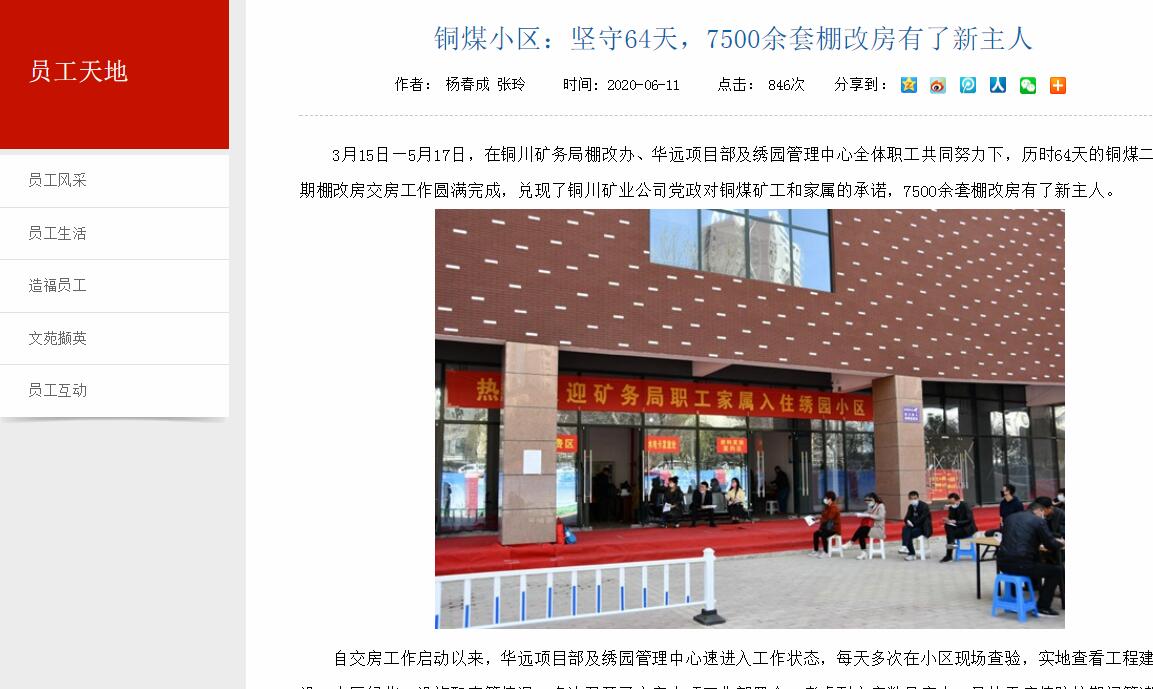 3月15日—5月17日,在銅川礦務局棚改辦、華遠項目部及繡園管理中心全體職工共同努力下,歷時64天的銅煤二期棚改房交房工作圓滿完成,兌現(xiàn)了銅川礦業(yè)公司黨政對銅煤礦工和家屬的承諾,7500余套棚改房有了新主人。