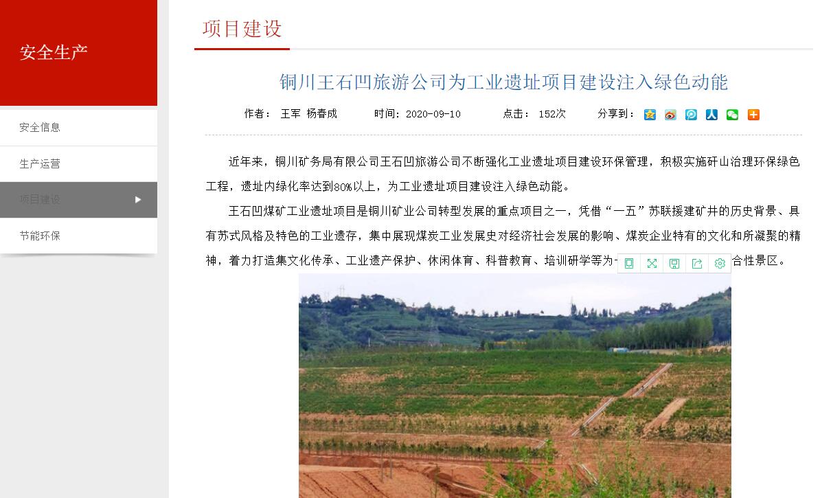 近年來,銅川礦務(wù)局有限公司王石凹旅游公司不斷強(qiáng)化工業(yè)遺址項目建設(shè)環(huán)保管理,積極實施矸山治理環(huán)保綠色工程,遺址內(nèi)綠化率達(dá)到80%以上,為工業(yè)遺址項目建設(shè)注入綠色動能。