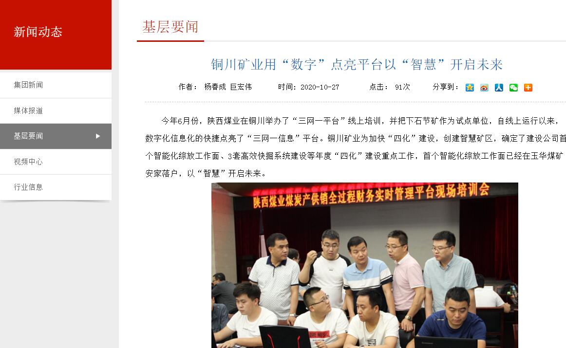 今年6月份,陜西煤業(yè)在銅川舉辦了“三網(wǎng)一平臺”線上培訓,并把下石節(jié)礦作為試點單位,自線上運行以來,數(shù)字化信息化的快捷點亮了“三網(wǎng)一信息”平臺。銅川礦業(yè)為加快“四化”建設,創(chuàng)建智慧礦區(qū),確定了建設公司首個智能化綜放工作面、3套高效快掘系統(tǒng)建設等年度“四化”建設重點工作,首個智能化綜放工作面已經(jīng)在玉華煤礦安家落戶,以“智慧”開啟未來。