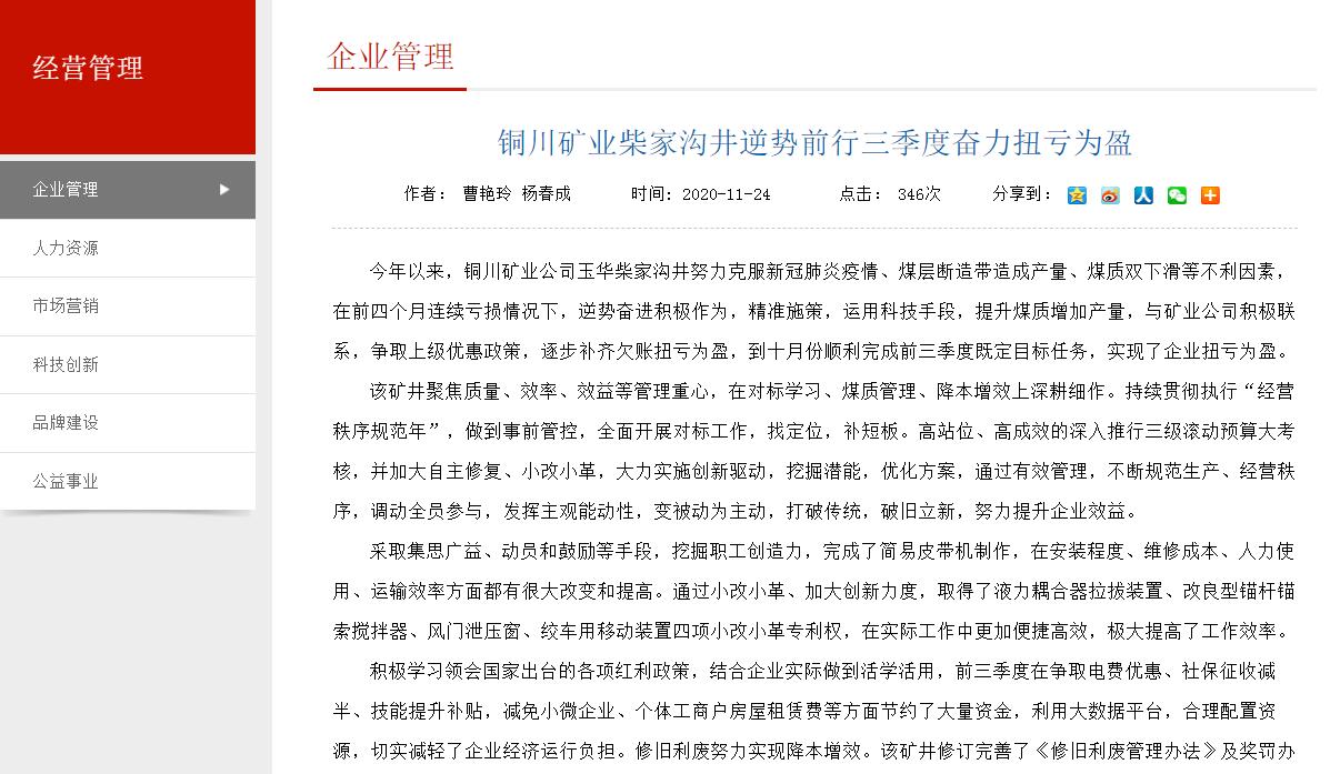銅川礦業(yè)柴家溝井逆勢前行三季度奮力扭虧為盈