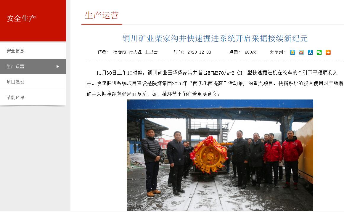 11月30日上午10時整,銅川礦業(yè)玉華柴家溝井首臺EJM270/4-2(H)型快速掘進機在絞車的牽引下平穩(wěn)順利入井??焖倬蜻M系統(tǒng)項目建設是陜煤集團2020年“兩優(yōu)化兩提高”活動推廣的重點項目,快掘系統(tǒng)的投入使用對于緩解礦井采掘接續(xù)緊張局面及采、掘、抽環(huán)節(jié)平衡有著重要意義。