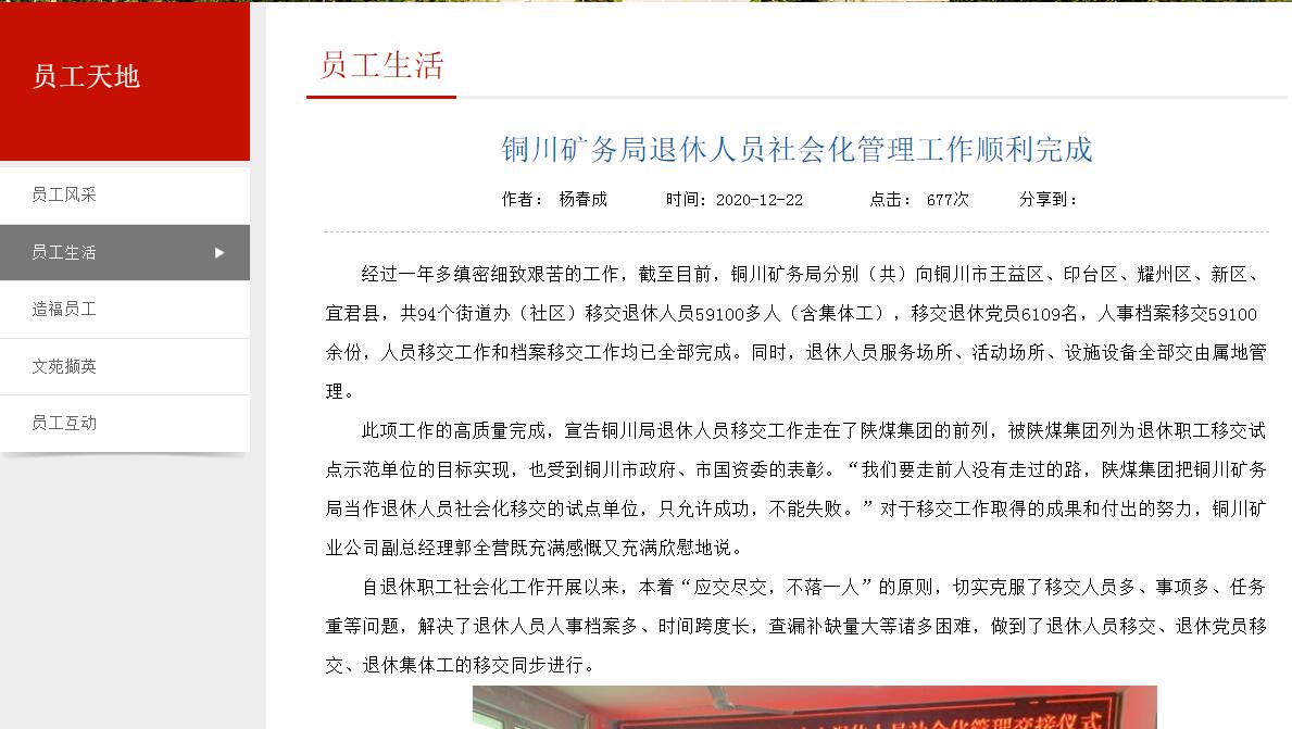 此項(xiàng)工作的高質(zhì)量完成,宣告銅川局退休人員移交工作走在了陜煤集團(tuán)的前列,被陜煤集團(tuán)列為退休職工移交試點(diǎn)示范單位的目標(biāo)實(shí)現(xiàn),也受到銅川市政府、市國(guó)資委的表彰。“我們要走前人沒(méi)有走過(guò)的路,陜煤集團(tuán)把銅川礦務(wù)局當(dāng)作退休人員社會(huì)化移交的試點(diǎn)單位,只允許成功,不能失敗。”對(duì)于移交工作取得的成果和付出的努力,銅川礦業(yè)公司副總經(jīng)理郭全營(yíng)既充滿感慨又充滿欣慰地說(shuō)。