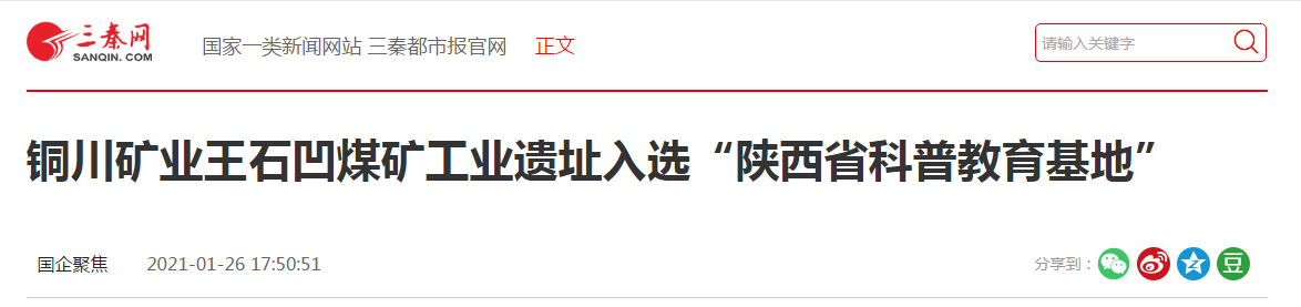 三秦都市報(bào)-三秦網(wǎng)訊(錢(qián)鍇 王軍 記者 王媚)近日,陜西省科學(xué)技術(shù)協(xié)會(huì)傳來(lái)對(duì)外發(fā)布全省33個(gè)“2020--2025年陜西省科普教育基地”,銅川礦業(yè)王石凹煤礦工業(yè)遺址名列其中,是此次“陜西省科普教育基地”認(rèn)定中唯一煤礦科普教育基地。
