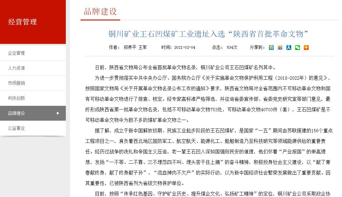 目前,按照“傳承紅色基因、守護礦業(yè)歷史、提升煤企文化、弘揚礦工精神”的定位,銅川礦業(yè)公司采取政企協(xié)作的形式,以高度的文化自信,規(guī)劃、保護、利用王石凹煤礦,讓革命文物成為講述革命歷史的重要載體,更好的弘揚煤企精神、傳承紅色基因。(鄭養(yǎng)平 王軍)