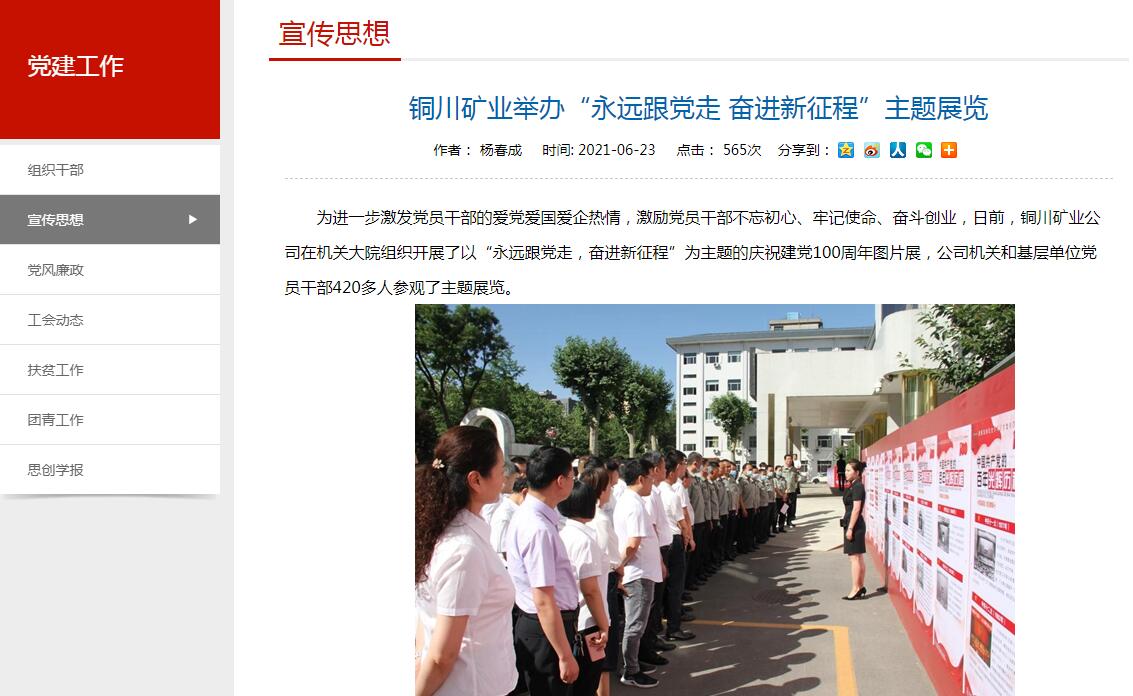 為進(jìn)一步激發(fā)黨員干部的愛(ài)黨愛(ài)國(guó)愛(ài)企熱情,激勵(lì)黨員干部不忘初心、牢記使命、奮斗創(chuàng)業(yè),日前,銅川礦業(yè)公司在機(jī)關(guān)大院組織開(kāi)展了以“永遠(yuǎn)跟黨走,奮進(jìn)新征程”為主題的慶祝建黨100周年圖片展,公司機(jī)關(guān)和基層單位黨員干部420多人參觀(guān)了主題展覽。