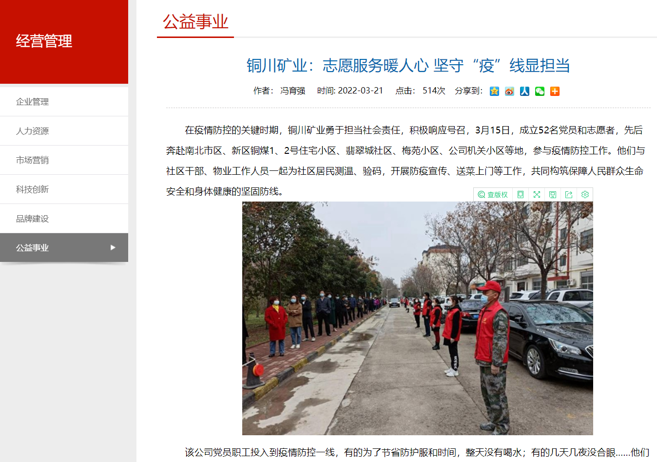 在疫情防控的關(guān)鍵時(shí)期,銅川礦業(yè)勇于擔(dān)當(dāng)社會(huì)責(zé)任,積極響應(yīng)號(hào)召,3月15日,成立52名黨員和志愿者,先后奔赴南北市區(qū)、新區(qū)銅煤1、2號(hào)住宅小區(qū)、翡翠城社區(qū)、梅苑小區(qū)、公司機(jī)關(guān)小區(qū)等地,參與疫情防控工作。他們與社區(qū)干部、物業(yè)工作人員一起為社區(qū)居民測(cè)溫、驗(yàn)碼,開(kāi)展防疫宣傳、送菜上門(mén)等工作,共同構(gòu)筑保障人民群眾生命安全和身體健康的堅(jiān)固防線。