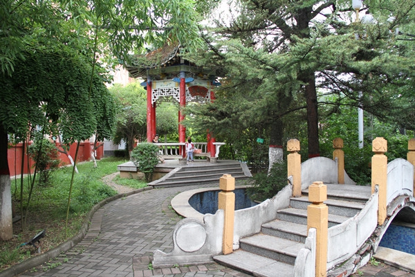 兩位退休職工在礦區(qū)文化廣場(chǎng)邊走邊聊。