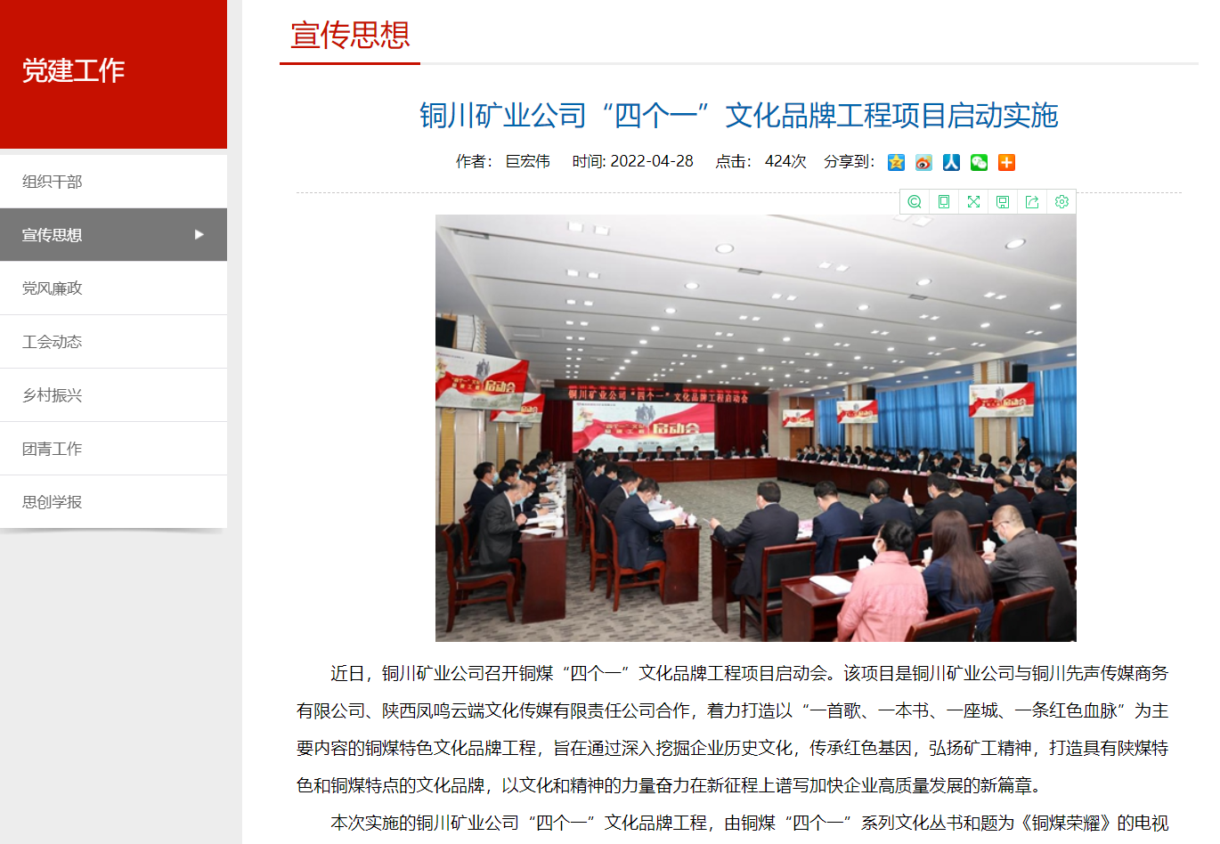 近日,銅川礦業(yè)公司召開銅煤“四個(gè)一”文化品牌工程項(xiàng)目啟動(dòng)會(huì)。該項(xiàng)目是銅川礦業(yè)公司與銅川先聲傳媒商務(wù)有限公司、陜西鳳鳴云端文化傳媒有限責(zé)任公司合作,著力打造以“一首歌、一本書、一座城、一條紅色血脈”為主要內(nèi)容的銅煤特色文化品牌工程,旨在通過深入挖掘企業(yè)歷史文化,傳承紅色基因,弘揚(yáng)礦工精神,打造具有陜煤特色和銅煤特點(diǎn)的文化品牌,以文化和精神的力量奮力在新征程上譜寫加快企業(yè)高質(zhì)量發(fā)展的新篇章。