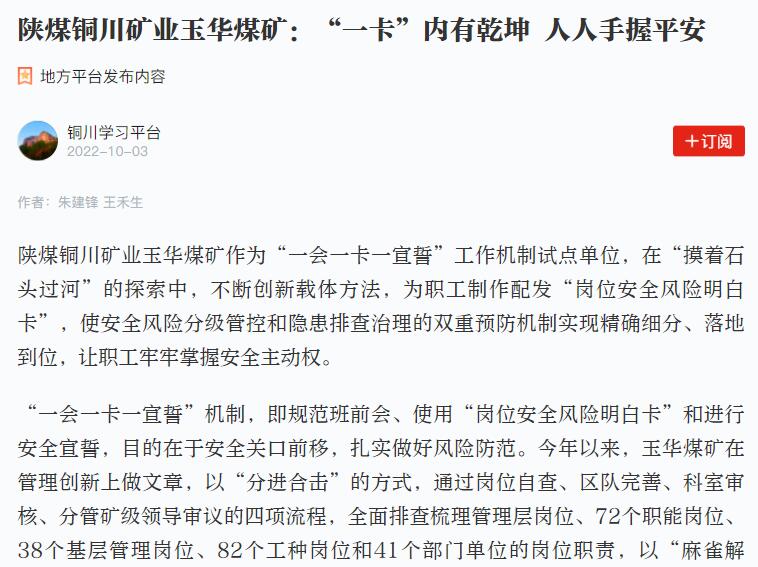 陜煤銅川礦業(yè)玉華煤礦作為“一會(huì)一卡一宣誓”工作機(jī)制試點(diǎn)單位,在“摸著石頭過河”的探索中,不斷創(chuàng)新載體方法,為職工制作配發(fā)“崗位安全風(fēng)險(xiǎn)明白卡”,使安全風(fēng)險(xiǎn)分級管控和隱患排查治理的雙重預(yù)防機(jī)制實(shí)現(xiàn)精確細(xì)分、落地到位,讓職工牢牢掌握安全主動(dòng)權(quán)。