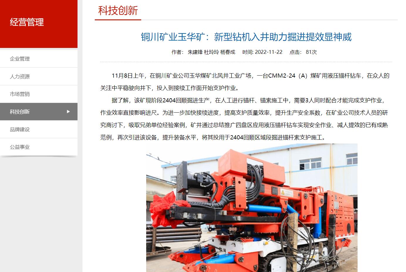11月8日上午,在銅川礦業(yè)公司玉華煤礦北風(fēng)井工業(yè)廣場,一臺CMM2-24(A)煤礦用液壓錨桿鉆車,在眾人的關(guān)注中平穩(wěn)駛向井下,投入到接續(xù)工作面開始支護作業(yè)。