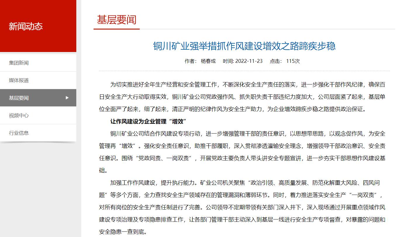 礦業(yè)公司堅(jiān)持作風(fēng)建設(shè)永遠(yuǎn)在路上,努力打造“5534”模式,深入推進(jìn)作風(fēng)建設(shè)專項(xiàng)行動(dòng),樹立攻堅(jiān)克難新標(biāo)桿,激發(fā)實(shí)干興業(yè)精氣神,以只爭朝夕、盡忠職守的過硬作風(fēng)助推企業(yè)高質(zhì)量發(fā)展。