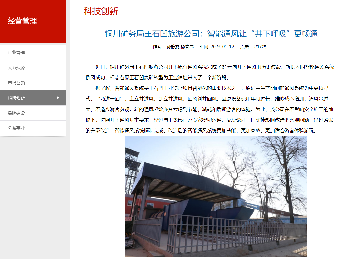 近日,銅川礦務(wù)局王石凹旅游公司井下原有通風(fēng)系統(tǒng)完成了61年向井下通風(fēng)的歷史使命。新投入的智能通風(fēng)系統(tǒng)倒風(fēng)成功,標志著原王石凹煤礦轉(zhuǎn)型為工業(yè)遺址進入了一個新階段。
