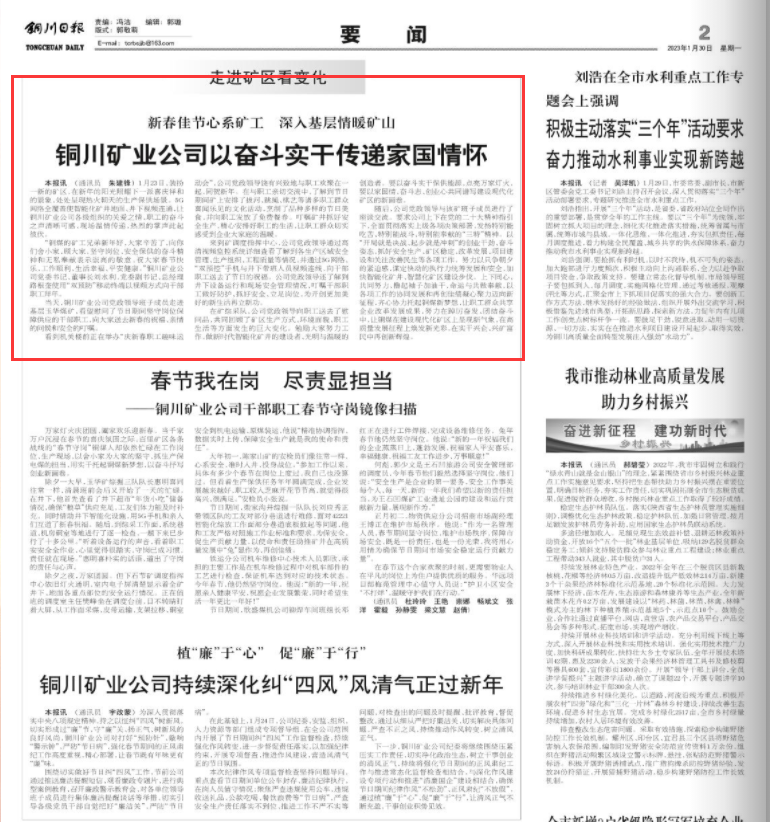 當天,銅川礦業(yè)公司黨政領導班子成員走進基層玉華煤礦,看望慰問了節(jié)日期間堅守崗位保障供應的干部職工,向大家送去新春的祝福、親情的問候和安全的叮囑。
