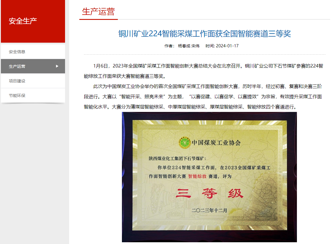 銅川礦業(yè)224智能采煤工作面獲全國智能賽道三等獎(jiǎng)