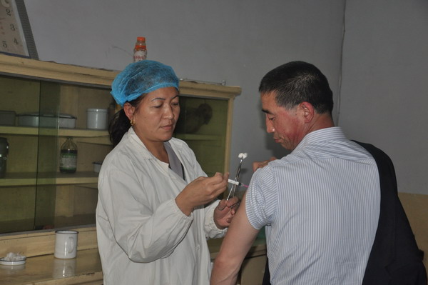 圖為醫(yī)護(hù)人員為礦職工注射流行性出血熱疫苗。