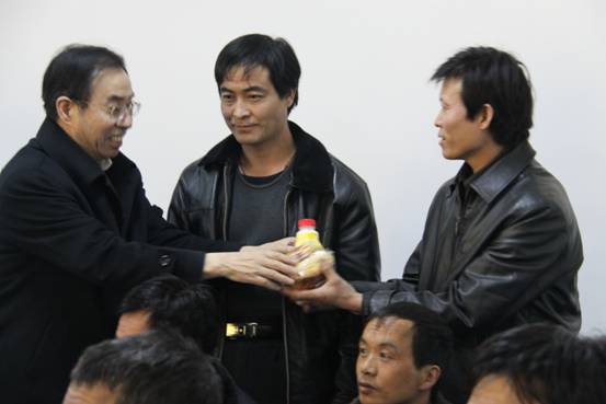鴨口公司董事長兼總經(jīng)理張會縣、黨委書記蘭阿利、副總經(jīng)理閆社會、工會主席王泰昌正在送慰問品。
