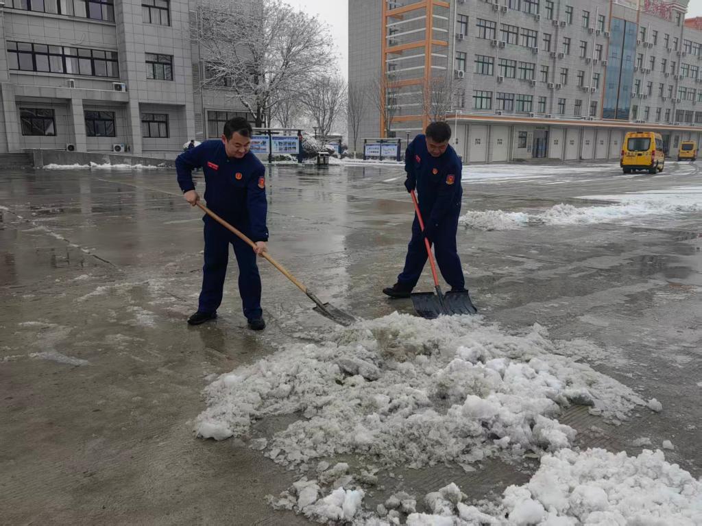 大隊(duì)第一時(shí)間組織各中隊(duì)及科室攜帶鐵鍬、掃帚、推雪板等清掃工具,奔赴各責(zé)任區(qū)域,清掃主干道、車庫門前、訓(xùn)練場(chǎng)地及主要出入口的積雪暗冰,確保各環(huán)節(jié)安全無虞。