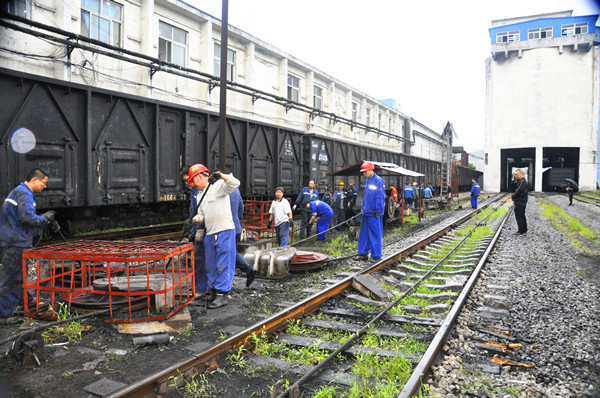 玉華煤礦洗選區(qū)拉運火車皮的導向輪位于鐵路第二軌道,自安裝后,在維護組精心保養(yǎng)下安全運行至今,由于長時間摩擦,造成繩輪處部分磨損出現(xiàn)凹槽,為確保系統(tǒng)安全運行,保障鐵運原煤銷售,按照檢修計劃對所有隱患進行清理。在該礦分管礦領(lǐng)導、跟班干部及技術(shù)人員的指導下,齊心合力將直徑為4厘米的鋼絲繩從重達六七百公斤的輪子上掏開擺順、卸下舊輪、將新輪安放調(diào)整到位、穿入繩子,通過拉、抬、撬等一系列工序,有條不紊地更換著繩輪。經(jīng)過干群10余個小時的奮戰(zhàn)終于順利完成了此次更換工作,為該礦原煤銷售消除了安全隱患,掃清了障礙。雨水浸濕參戰(zhàn)人員的衣物,但當大家看著安全拉運的鋼絲繩,發(fā)出了勝利的喜悅。用責任擔當踐行運煤使命,充分彰顯了玉華人不怕困難、群策群力、頂風冒雨忘我工作的愛崗敬業(yè)精神。