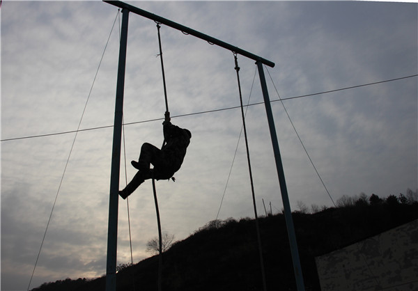 一聲短促有力的集合哨音打破院中寧靜,二小隊的隊員們精神抖擻列隊完畢。8公里跑步拉練熱身后,手握還沾著露水的繩索,一個個身手迅捷、揮汗如雨的開始了爬繩、單杠、舉重課目操練。玉華煤礦救護(hù)中隊隊員在這寂靜的礦區(qū)清晨開始了日常訓(xùn)練。