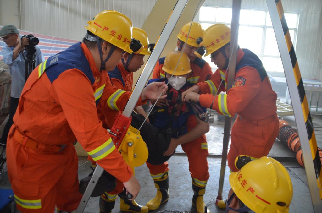 上午10時整,隨著各參演隊(duì)伍到達(dá)演練地點(diǎn),演練正式拉開帷幕,演練設(shè)置有通風(fēng)供氧、氣體檢測、心肺復(fù)蘇、急救包扎等科目。在救援演練現(xiàn)場,通風(fēng)組首先安裝風(fēng)機(jī)并使用手提式通風(fēng)機(jī)持續(xù)向有限空間內(nèi)輸送新鮮空氣;氣體檢測組使用泵吸式多種氣體檢測儀對地坑內(nèi)氣體含量進(jìn)行實(shí)時檢測,報告氣體變化情況;救援組迅速搭建救援三腳架,在對事發(fā)過程和地坑內(nèi)環(huán)境了解確認(rèn)后,攜帶裝備入坑搜救。在坑口不遠(yuǎn)處發(fā)現(xiàn)2名中毒昏迷人員后,救援人員將其運(yùn)送至地面,現(xiàn)場對2名中毒窒息工人采用自動蘇生器進(jìn)行搶救,并對1名骨折職工進(jìn)行包扎處理,在恢復(fù)正常體征后,迅速送醫(yī)治療。