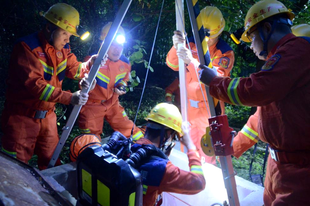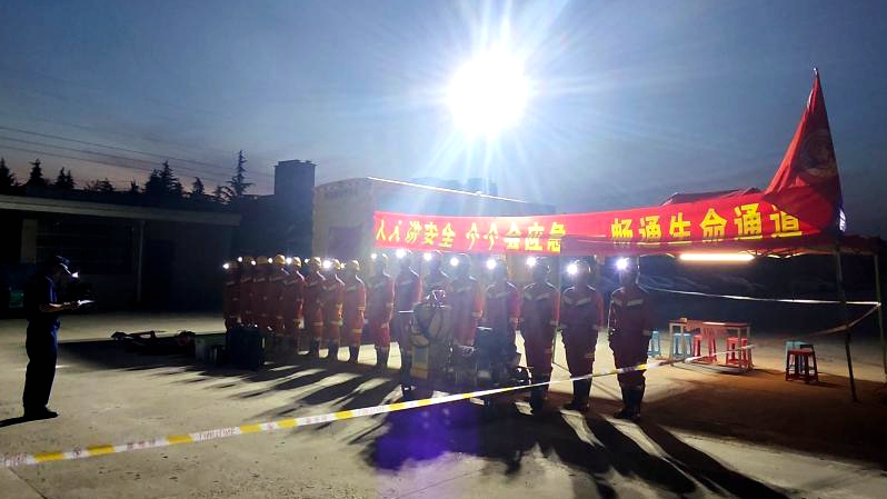 到達(dá)演練現(xiàn)場,指戰(zhàn)員按照救援預(yù)案完成事故現(xiàn)場進(jìn)行探察,昏暗的夜色中快速啟動照明發(fā)電車、敷設(shè)水帶、安裝水泵,恢復(fù)廠區(qū)供電照明,實(shí)施排水作業(yè)。待蓄水池水位下降后,按照“先通風(fēng),再檢測,后作業(yè)”的要求,對遇險人員進(jìn)行搜救,當(dāng)晚21時許經(jīng)過一個小時的緊張作業(yè),全面完成救援演練任務(wù)。