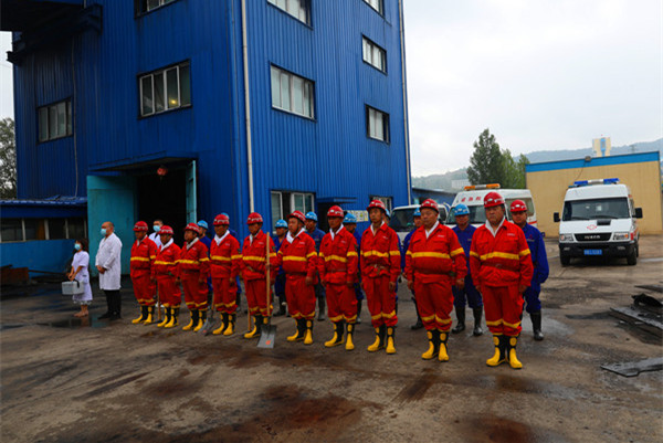 根據(jù)演練設(shè)定模擬險(xiǎn)情,該礦立即啟動(dòng)《汛期“三防”應(yīng)急預(yù)案》,地面指揮部統(tǒng)一指揮協(xié)調(diào)應(yīng)急救援工作??傊笓]發(fā)出集結(jié)指令,10分鐘之內(nèi),防汛應(yīng)急指揮部全體成員集結(jié)完畢,礦防汛搶險(xiǎn)小隊(duì)、駐礦救護(hù)中隊(duì)火速到達(dá)集合點(diǎn),應(yīng)急救援的技術(shù)、安全、醫(yī)療、保障、通訊等小組各自就位??傊笓]按照預(yù)案指定各專業(yè)救援小組和防汛搶險(xiǎn)各小隊(duì),立即趕赴災(zāi)情地點(diǎn),實(shí)施應(yīng)急處置。整體應(yīng)急搶險(xiǎn)救援分為兩步驟同時(shí)進(jìn)行,搶險(xiǎn)組出發(fā)趕往北風(fēng)井工業(yè)廣場(chǎng),在北斜井井口使用防汛專庫(kù)物資構(gòu)筑堅(jiān)實(shí)的防水墻,安裝應(yīng)急排水泵、連接排水管等進(jìn)行排水作業(yè),有效防止雨水倒灌。救援組在南風(fēng)井接應(yīng)井下撤離人員,并對(duì)升井人員進(jìn)行清點(diǎn)人數(shù),對(duì)身體不適人員進(jìn)行詢問(wèn)檢查和醫(yī)療救治。經(jīng)過(guò)一個(gè)半小時(shí)的搶險(xiǎn)作業(yè),險(xiǎn)情得到有效處置,圓滿完成此次防汛搶險(xiǎn)演練。