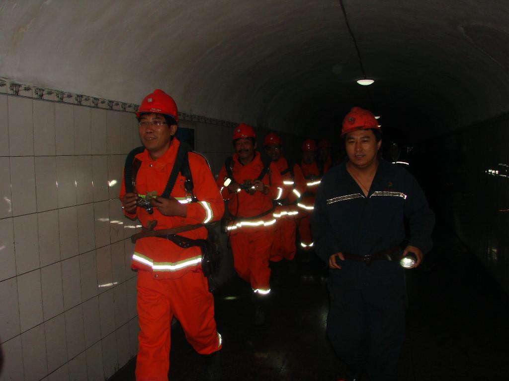 當日15時05分,礦調(diào)度室電話猝然急響,“東二擴大區(qū)2102進順工作面探眼內(nèi)涌水,1小時內(nèi)涌水量迅速擴大,12人被困井下……!”險情突現(xiàn),礦井事故應(yīng)急救援預(yù)案立即啟動,總調(diào)度、總指揮、救援指揮部等全部進入應(yīng)急狀態(tài),命令掘進隊“迅速撤離工作面,地測科及生產(chǎn)科人員下井進行水情調(diào)查!”25分鐘,被困人員按避災(zāi)線路撤離到擴大區(qū)變電所口,其間,跟班隊長報告“1名職工撤離途中腰部傷”。 應(yīng)急指揮部副組長昝六民立即帶領(lǐng)救護隊員下井救援。17時20分,受傷礦工成功獲救。整個演習,從接到現(xiàn)場匯報開始,經(jīng)過礦應(yīng)急小組調(diào)度各種資源組織避災(zāi)、自救,到受“涌水事故”威脅的12人全部安全升井,用時2小時40分鐘。其中進行了報警、接警演習、撤人演習、地面應(yīng)急演習,使職工熟悉了發(fā)生水災(zāi)事故時的撤退線路,增長了避災(zāi)知識,進一步了解了應(yīng)急措施啟動后的程序,全面檢驗了礦井防治水管理水平和礦井防災(zāi)抗災(zāi)的能力。