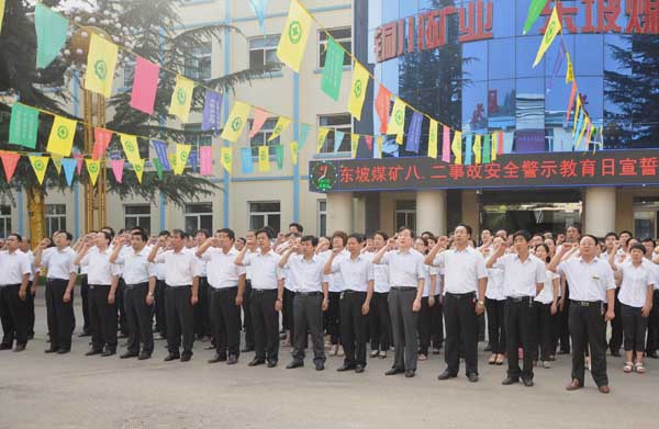 在礦部,副礦長(zhǎng)兼安監(jiān)處長(zhǎng)張東風(fēng)主持宣誓活動(dòng),礦黨委副書記兼紀(jì)委書記奚建國(guó)發(fā)表講話,礦領(lǐng)導(dǎo)、機(jī)關(guān)全體工作人員回顧2011年發(fā)生的“8·2”頂板事故,總結(jié)2年來(lái)的安全得失,進(jìn)一步堅(jiān)定安全“零”目標(biāo),共同宣誓:“忠誠(chéng)履職,恪盡職守,珍愛(ài)生命 ,安全工作!”