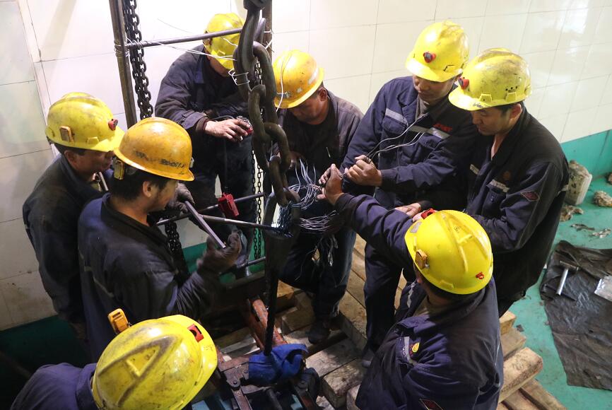 11日上午8:00,開(kāi)始更換鋼絲繩。此時(shí)需要做好鉤頭放置標(biāo)記,記好深度指示器米數(shù),將舊鋼絲繩拉出,將新鋼絲繩纏繞到滾筒,恢復(fù)深度指示器離合,恢復(fù)數(shù)字編碼器,校正即可完成。施工期間,該項(xiàng)目部相關(guān)領(lǐng)導(dǎo)、部室負(fù)責(zé)人、區(qū)隊(duì)主要領(lǐng)導(dǎo)從鉤頭的制作,到鋼絲繩的收放、纏繞鋼絲繩,再到試驗(yàn),全程跟蹤現(xiàn)場(chǎng)施工,督促現(xiàn)場(chǎng)安全管理,現(xiàn)場(chǎng)指導(dǎo)解決更換過(guò)程中遇到的問(wèn)題;施工人員每個(gè)環(huán)節(jié)協(xié)調(diào)作業(yè),密切配合,確保了整個(gè)施工的平穩(wěn)推進(jìn)。