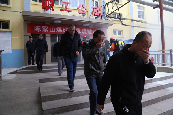 15時,演練正式開始。礦山救護三中隊接到“報警”,迅速趕到現(xiàn)場,經(jīng)確認火勢較大無法撲救后,快速組織職工有序撤離。在疏散撤離過程中,職工們按照指定路線,彎腰、用濕毛巾或袖口捂著嘴鼻快速有序撤離至指定安全集中區(qū)域,無人掉隊。