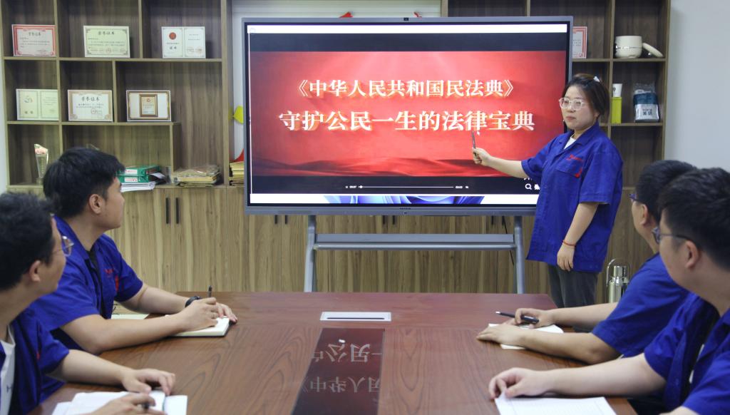 在公司機(jī)關(guān)黨員活動(dòng)室內(nèi),電子屏幕播放著公益宣傳片《中華人民共和國(guó)民法典》,該片通過(guò)宣介見(jiàn)義勇為免責(zé)、小區(qū)廣告收入歸業(yè)主、禁止高利貸、保護(hù)個(gè)人信息、界定夫妻共同債務(wù)、增加遺囑形式、明確高空拋物追償責(zé)任等七個(gè)方面內(nèi)容,涵蓋了日常生活各個(gè)方面,全面保護(hù)了公民的權(quán)利。隨后,法律宣傳員小陳結(jié)合實(shí)際案例,分析了企業(yè)在生產(chǎn)經(jīng)營(yíng)過(guò)程中可能遇到合同管理、知識(shí)產(chǎn)權(quán)等法律問(wèn)題,為在坐職工進(jìn)行了講解,并倡導(dǎo)大家在工作中自覺(jué)守法,辦事依法、遇事找法、解決問(wèn)題用法、化解矛盾靠法,為構(gòu)建和諧廠區(qū)筑牢法治根基。