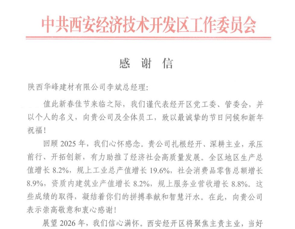 2月12日,華峰公司收到西安經開區(qū)管委會發(fā)來的感謝信,信中向該公司及全體員工致以節(jié)日問候與新年祝福,對公司2025 年為西安經開區(qū)高質量發(fā)展作出的貢獻予以高度肯定并表達衷心感謝。