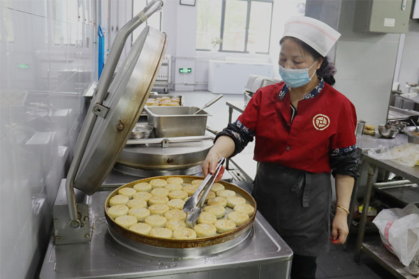 “師傅,這是您的手工中秋月餅請拿好,”在職工食堂打餐窗口后勤服務(wù)人員,將手工中秋月餅遞到前來打餐的職工們的手中。