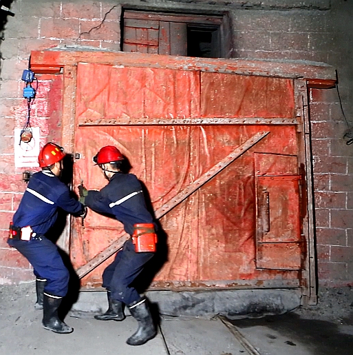 近日, 下石節(jié)煤礦在小改小革中,通防管理部的技術人員針對井下巷道壓力大、變形快,無法使用自動無壓風門的實際,通過借鑒防盜門中“子母門”設計思路,經過改革、創(chuàng)新,將風門門扇設計為一大一小的子母形式,大小風門均使用門軸固定在風門門框上,并采用滑輪、鋼絲繩實現(xiàn)風門連鎖,確保兩道正門或兩道反門不能同時打開,在局部區(qū)域試驗后實踐效果良好,隨后在礦井主要通風巷道全面推廣應用。