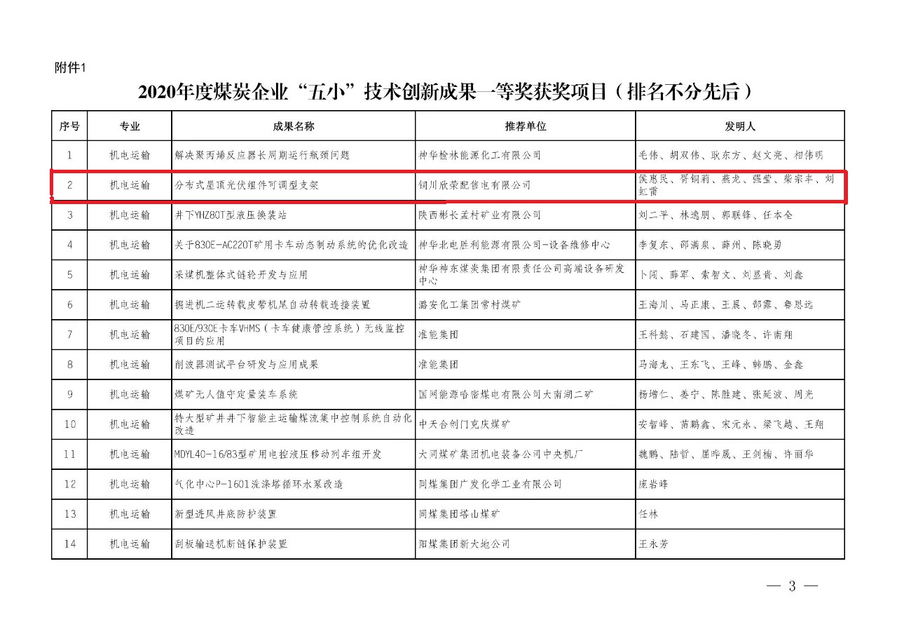 近日,中國煤炭工業(yè)協(xié)會公布了2020年度煤炭企業(yè)優(yōu)秀“五小”創(chuàng)新成果及征集活動優(yōu)秀組織獎,欣榮配售電有限公司兩項(xiàng)職工技術(shù)創(chuàng)新成果上榜,《分布式屋頂光伏組件可調(diào)型支架》榮獲2020年度煤炭企業(yè)“五小”技術(shù)創(chuàng)新成果一等獎;《下焦進(jìn)線開關(guān)防雷保護(hù)》榮獲2020年度煤炭企業(yè)“五小”技術(shù)創(chuàng)新成果二等獎。