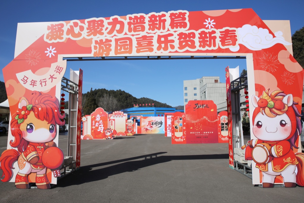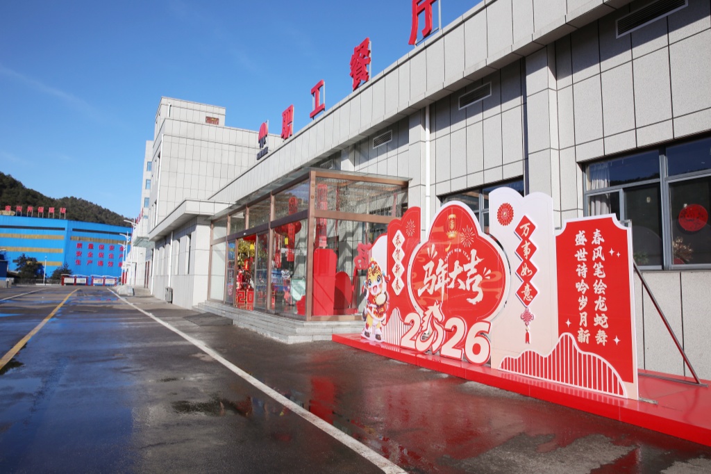 主干道上,大紅燈籠沿?zé)魲U整齊懸掛,在陽(yáng)光映照下格外喜慶醒目。1號(hào)公寓樓前,“凝心聚力譜新篇 游園喜樂(lè)賀新春”的拱門大氣莊重;職工餐廳門口,馬年卡通造型生動(dòng)可愛(ài),玻璃門內(nèi)新春裝飾錯(cuò)落有致,“馬年大吉”的溫馨布置,讓職工處處感受到家的溫暖。