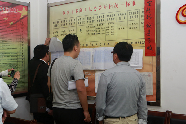 互檢工作組一行到礦后,與該礦領(lǐng)導(dǎo)進(jìn)行了座談,聽(tīng)取該礦開(kāi)展礦務(wù)公開(kāi)民主管理工作情況的匯報(bào)。隨后,互檢組成員對(duì)該礦工會(huì)礦務(wù)公開(kāi)民主管理基礎(chǔ)資料進(jìn)行查看,并到基層單位觀看了礦務(wù)、隊(duì)務(wù)公開(kāi)欄及職工活動(dòng)室。同時(shí)還組織該礦10名職工代表進(jìn)行了座談。