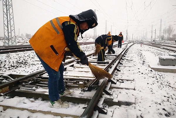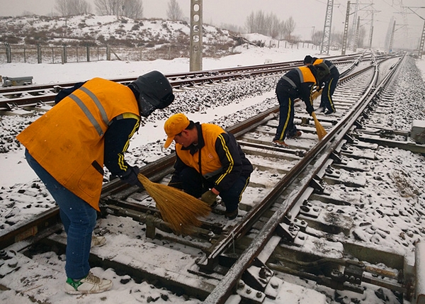 雪越下越大,地面積雪越來越厚。各站除雪小組對道岔堅(jiān)持看守,在除雪指揮部的指揮下,做到定期上道除雪,使道岔始終保持無積冰積雪狀態(tài),杜絕發(fā)生道岔空轉(zhuǎn)現(xiàn)象。同時,做好雪后道岔清掃涂油工作,組織除雪人員對道岔正反位和風(fēng)洞積雪再次徹底清掃,并使用長柄刷進(jìn)行涂油保養(yǎng),消除因低溫帶來的道岔結(jié)冰現(xiàn)象。