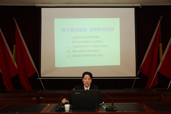 講座中,寇僖娟同志從當(dāng)前反腐敗斗爭(zhēng)的形勢(shì)和概況切入,結(jié)合陜西省內(nèi)、煤炭行業(yè)典型案例,先后對(duì)職務(wù)犯罪的感念、特征,職務(wù)犯罪產(chǎn)生的原因、危害,以及煤炭系統(tǒng)職務(wù)犯罪的特點(diǎn)等內(nèi)容進(jìn)行了深入淺出的講解;并歸納總結(jié)其多年從事預(yù)防職務(wù)犯罪工作的經(jīng)驗(yàn),提出了預(yù)防職務(wù)犯罪的建議和對(duì)策。