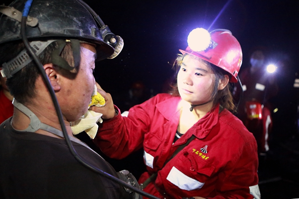經(jīng)過近兩個小時艱難跋涉,在千米井下幽深的巷道里,見到自己丈夫的礦嫂們心情格外激動,看到丈夫辛勤勞作的場景,許多礦嫂滿含熱淚,趕忙上前心疼的為丈夫擦汗,將慰問品送到丈夫手中,心中千言萬語匯成輕輕的一聲:老公,你辛苦了!