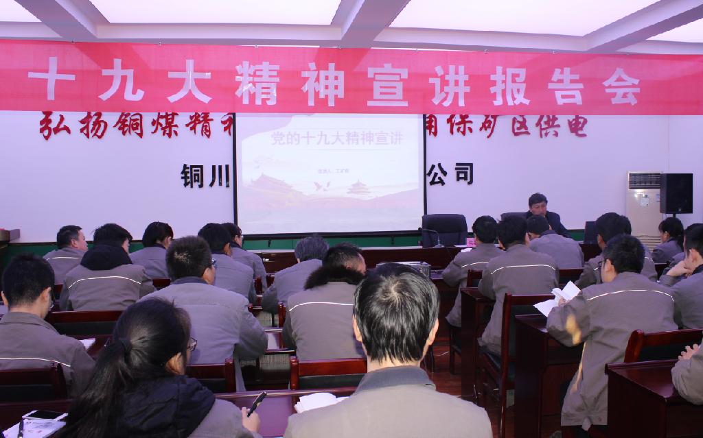 12月15日上午,為深入學(xué)習(xí)宣傳貫徹好黨的十九大精神,在礦業(yè)公司上下迅速掀起學(xué)習(xí)宣傳貫徹黨的十九大精神熱潮。銅川礦業(yè)公司黨的十九大精神宣講團(tuán)成員,陳家山煤礦黨委副書記王礦奇同志深入銅川欣榮配售電有限公司宣講黨的十九大精神,為該公司黨員干部職工深入淺出的解讀了黨的十九大精神,欣榮配售電有限公司副總以上領(lǐng)導(dǎo)、各支部書記、部門負(fù)責(zé)人以及黨員干部職工近60人,認(rèn)真聽取了宣講。