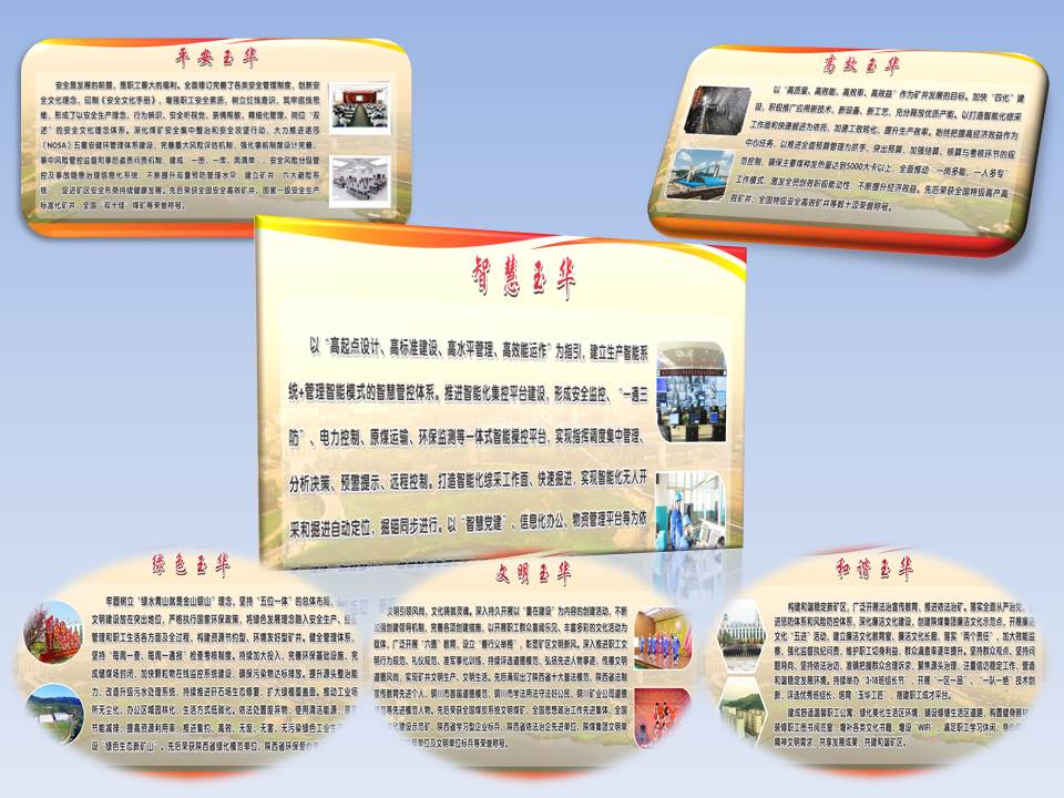 “平安玉華”以貫徹落實習近平總書記關于安全生產(chǎn)重要論述和指示批示精神為遵循,通過安全管理體系建設的文字圖片介紹展示礦井安全發(fā)展歷程,引領職工樹牢“生命至上、人民至上”安全發(fā)展觀?!案咝в袢A”圍繞提高經(jīng)濟效益中心任務,明確定位“高質量、高效能、高效率、高效益”工作目標?!爸腔塾袢A”描繪出“高起點設計、高標準建設、高水平管理、高效能運作”的“智慧黨建”、智能化開采、智能化快掘等同步一體式建設“智慧礦山”的發(fā)展藍圖?!拔拿饔袢A”引領向上向善、立德樹人文明之力,形成奮發(fā)有為、崇德向善的濃厚氛圍?!昂椭C玉華”堅持群眾路線,“以人民為中心”著眼職工利益和幸福生活,全力打造“扎根工程”和民心工程?!熬G色玉華”把生態(tài)建設擺在突出位置,全面構建資源節(jié)約型、環(huán)境友好型的綠色生態(tài)新礦山。