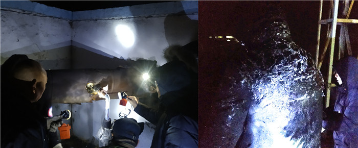 第一組轉運自來水進行有序。第二組進行焊接異常艱難,架空管路先進行化冰排水,在滴水成冰的條件下,焊接人員裹上了一身“冰甲”仍在堅持作業(yè)。物業(yè)公司經理、支部書記帶隊第三組攻堅,每名黨員干部分包一段管路清塞,并逐漸將搶修范圍擴展至2000余米。