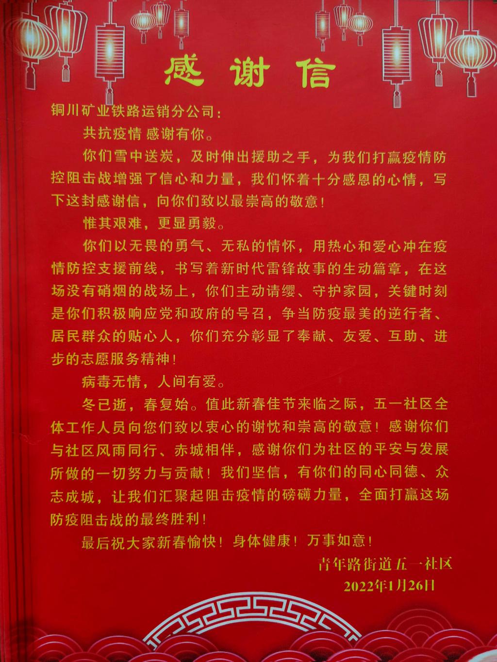 感謝信中指出,在疫情防控工作中,鐵運分公司積極響應(yīng)黨和政府號召,組織志愿者服務(wù)隊下沉社區(qū)支援疫情防控工作,下沉同志以無畏的勇氣、無私的情懷,爭當(dāng)防疫最美的逆行者、居民群眾的貼心人,用熱心和愛心沖在疫情防控支援前線,充分彰顯了奉獻(xiàn)、友愛、互助、進(jìn)步的志愿服務(wù)精神,書寫了新時代雷鋒故事的生動篇章, 感謝鐵運分公司為社區(qū)的平安與發(fā)展所做的一切努力與貢獻(xiàn),希望雙方同心同德、眾志成城,匯聚起阻擊疫情的磅礴力量,全面打贏這場防疫阻擊戰(zhàn)的最終勝利。