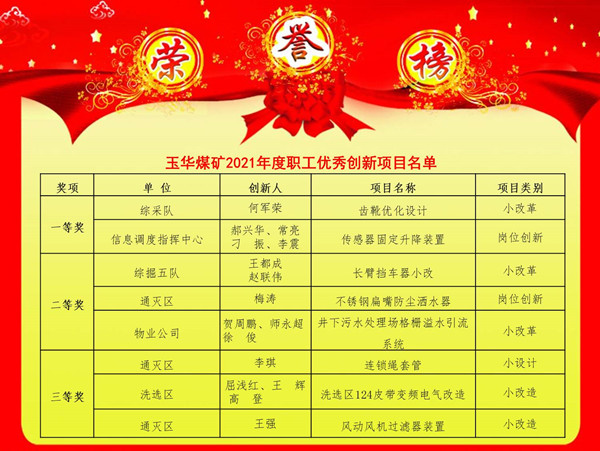 玉華煤礦2022年“五會(huì)”上,經(jīng)過(guò)層層推薦評(píng)定,8個(gè)“五小”及職工創(chuàng)新項(xiàng)目憑借助力安全生產(chǎn)的良好實(shí)用性及經(jīng)濟(jì)效益,自60個(gè)創(chuàng)新項(xiàng)目中脫穎而出,摘得了廣受關(guān)注的礦井2021年度創(chuàng)新大獎(jiǎng),創(chuàng)新舞臺(tái)群星閃耀,創(chuàng)新熱詞引領(lǐng)風(fēng)潮。
