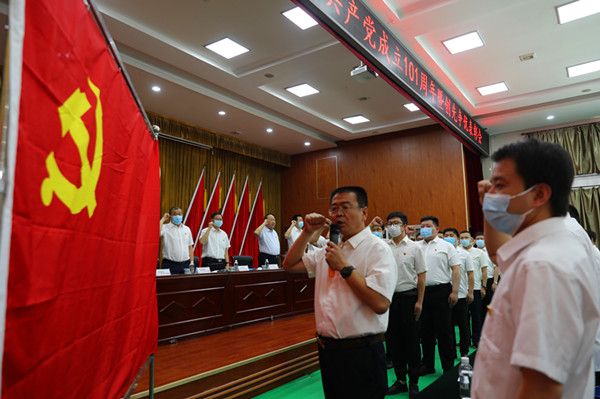 上午10時,大會在雄壯的國歌聲中開幕。 24名納新黨員面對黨旗,舉起右拳進行了莊嚴的入黨宣誓,全體參會人員重溫入黨誓詞。
